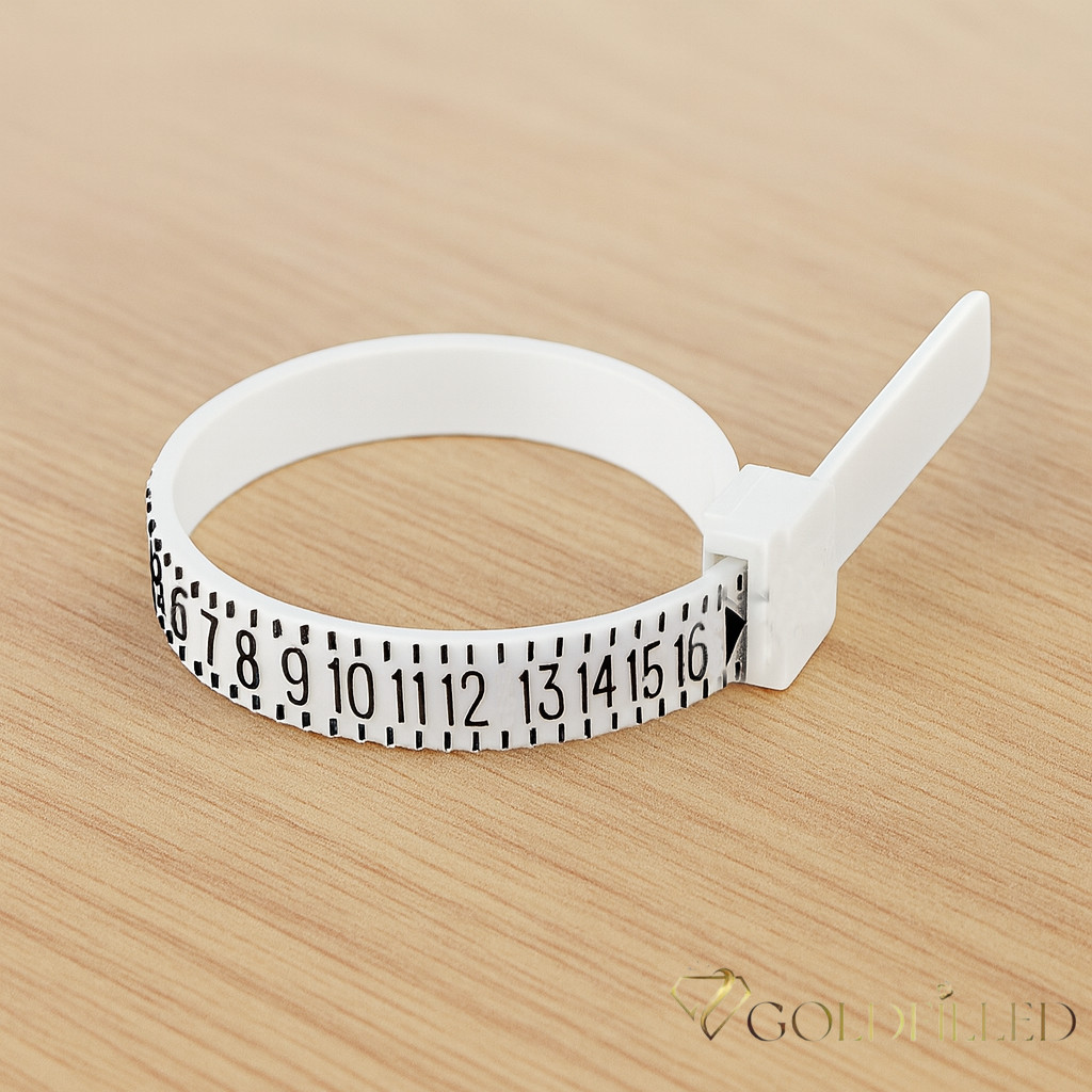 Ring size measuring tool (ali Ring sizer) To je nastavljiv plastični merilnik prstanov, s katerim lahko natančno izmerite obseg prsta pri nakupu prstana.